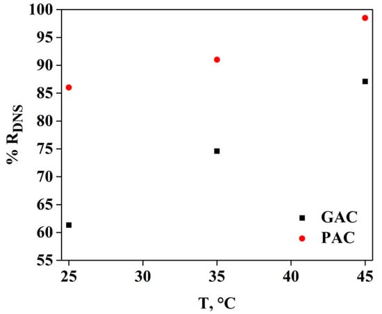 The removal percentage of DNS using different temperatures is shown in Figure 2 for both samples of AC. In this figure, it could be observed that the increase in DNS removal had a linear trend concerning temperature, having 87 and 99% removal for GAC and PAC, respectively. In addition, it was noted that at 45 °C there was the maximum point of this percentage in GAC, but at 25 °C there was the minimum removal value for PAC, which indicates that it may have a direct relationship between the surface of the adsorbent, the operating temperature and the environment in which the DNS clearing process takes place. In the case of primidone removal, a removal percentage of 100% was obtained at 25 °C [12], and in the case of removal of chemical oxygen demand (COD), dissolved organic carbon (DOC) and total hydrocarbons of petroleum (TPH) present in ship wastewater, a removal percentage of 80, 68 and 76%, respectively, was shown using GAC [13].