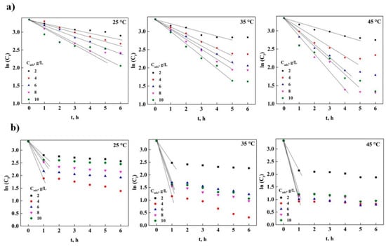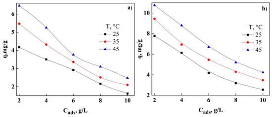 In Figure 3, the effect of the variation of adsorbent concentration (Cads) on the adsorption of DNS is shown. It can be observed that the adsorption capacity in GAC and PAC decreases almost linearly with the increase in Cads, which varies from 2 to 10 g/L. This causes the removal percentage to change from 67% at 25 °C to 48 and 53% at 35 and 45 °C, respectively, for GAC. The same variation of Cads was used in PAC where the removal percentage at 25 °C was 69.8% and increased to 90 and 91% at 35 and 45 °C, respectively. This behavior is due to the active adsorption sites that have been exhausted or blocked by the variety on the surface of both adsorbents. In addition, the increase in the removal percentage can be assumed by the reduction of the adsorbate-adsorbent ratio with the increase of the adsorbent concentration [12,28,39]. DNS removal using GAC and PAC also shows an increase with temperature, obtaining a removal percentage of 64, 74.6, and 86.6% at 25, 35, and 45 °C, respectively, for GAC. While for PAC the removal percentages of 59.3, 91, and 92.1% were obtained at 25, 35, and 45 °C, respectively. This increase in removal may be due to the concentration of the adsorbents, where the availability of the active adsorption site is more accessible. With these results, it can be mentioned that PAC retains more of the DNS on its surface with increasing temperature [12].