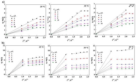 The analysis of the external and intraparticle mass transfer process can have a significant effect on the adsorption of DNS, since the information obtained in Table 5 and Table 6 indicate that the limitations due to transport of matter could be present in the removal of DNS, which makes it necessary to carry out an analysis of this phenomenon [36]. Figure 4a is constructed using the external diffusion model as a basis, where it can be seen that for GAC there is a straight line at the experimental points for up to 6 h of contact in the adsorption process, which indicates the possibility that there is control by external mass transfer in the process at any temperature [28]; this type of behavior is similar to that reported in the literature for the adsorption of organic matter components from ship waste [13]. Figure 4b shows the representation of the experimental data obtained for PAC in the adsorption of DNS, where a straight line was observed at 1 h of contact with the adsorbent. This indicates that there are no external mass transfer problems using particles of AC, because DNS is quickly removed from the solution diffusing towards the surface. Furthermore, this suggests that the adsorption process in AC particles may be due to the functional groups present on the surface. Based on these results, it is established that it is important to know if there are also internal mass transfer problems and thus be able to determine if the DNS removal process is significantly affected by the presence of this phenomenon.