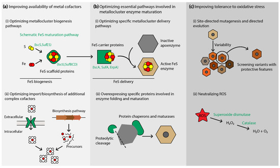 Strategies to enhance metallocluster enzyme maturation and stability. (a,b) A schematic representation of prokaryotic FeS maturation is presented as an example of the different steps and specific proteins involved in metallocluster enzyme maturation. The availability of metal cofactors can be improved by optimizing their biosynthesis or cellular import (a), or by optimizing essential pathways involved in post-translational modifications and protein maturation (b). (c) Reducing effects of oxidative stress.
