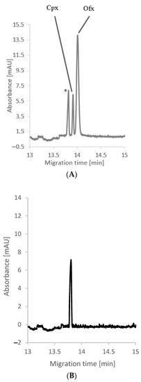 (A) Representative electropherogram obtained for meat tissue spiked with Cpx and Ofx (final concentration 1.4 ppm (4 nmol/g tissue)). * The peak corresponds to the non-identified component of the sample. (B) Representative electropherogram obtained for blank meat tissue.