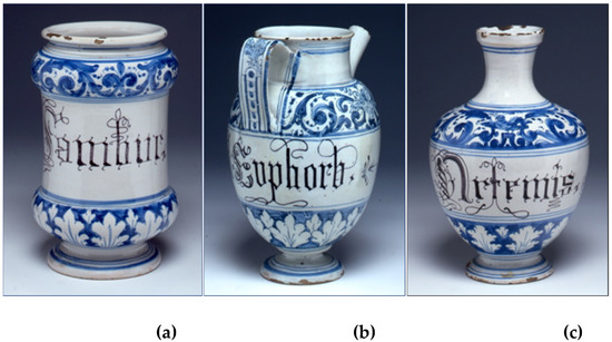 - Zanchi, G. La collezione dei vasi da farmacia. In Ospedale Maggiore/Ca’ Granda. Collezioni Diverse; Electa: Milano, Italy, 1988; pp. 273–316. [Google Scholar]