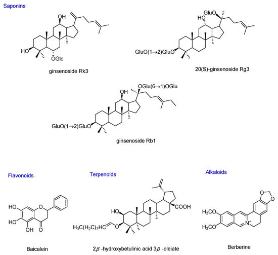 The diet and its metabolites have a major physiological impact on the composition of gut microbiota and the health of the host [22]. In China, MFH and FF refers to a group of foods that can also be used as medicines, many of which possessed anti-hyperglycemic activities. Regular consumption of MFH, which is considered to affect glycemic control, activation of antioxidant enzymes and gut microbiota, and to inhibit the excessive production of pro-inflammatory cytokines, to prevent or treat T2DM [25]. MFH and FF have been widely sought recently, and research into their use for T2DM has evoked considerable interest. Herein, the bioactive ingredients of MFH and MHF were divided into: saponins, polysaccharides, flavonoids, terpenoids, alkaloids, and others, and their anti-diabetic effects via gut miocrobiota regulation were listed in Table 1, and the chemical structures of the representative compounds are shown in Figure 2.