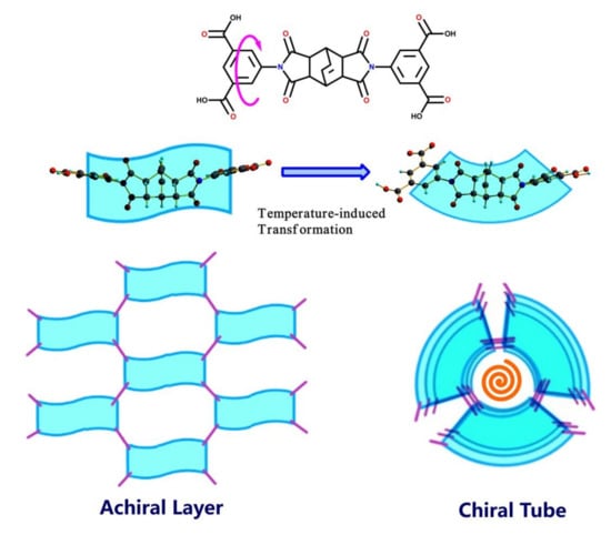 - Wu, D.; Zhou, K.; Tian, J.; Liu, C.; Tian, J.; Jiang, F.; Yuan, D.; Zhang, J.; Chen, Q.; Hong, M. Induction of Chirality in a Metal–Organic Framework Built from Achiral Precursors. Angew. Chem. Int. Ed. 2021, 60, 3087–3094. [Google Scholar] [CrossRef] [PubMed]
