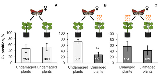 - Landolt, P.J. Effects of host plant leaf damage on cabbage looper moth attraction and oviposition. Entomol. Exp. Appl. 1993, 67, 79–85. [Google Scholar] [CrossRef]