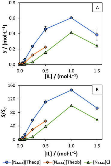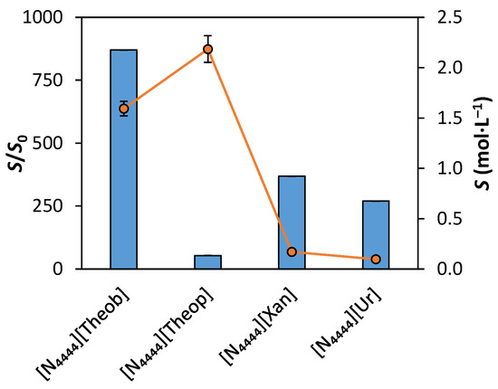 To study the solubility enhancement capacity of the purine-based ILs, aqueous solutions of [N4444][Theop] and [N4444][Theob] were prepared at different molar concentrations, and ferulic acid was used as a poorly water-soluble solute. The lower solubility of [N4444][Ur] and [N4444][Xan] prevented the study of their solubility enhancement capacity. [N4444]Cl solubility enhancement capacity was also studied, in order to compare its efficiency with the purine-based ILs. The molar solubility and the molar aqueous solubility enhancement (S/S0) of ferulic acid at different concentrations of IL are depicted in Figure 6, and detailed data can be consulted in the Supplementary Materials (Table S12). The S0 value (0.0041 ± 0.0002 mol∙L−1) was obtained by saturating ferulic acid in pure water, which is in agreement with the reported ferulic acid water-solubility of 0.00470 ± 0.00001 mol∙L−1 [72]. The IL integrity was confirmed by 1H and 13C NMR. No data is presented for [N4444][Theob] at 1.0 and 1.5 mol∙L−1 since ionic exchange was verified at these IL concentrations.