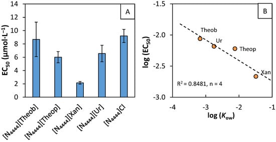 (A) EC50 values (μmol∙L−1), determined after 96 h of exposure time of Raphidocelis subcapitata to the purine-based salts and [N4444]Cl. The error bars correspond to the 95% confidence interval. (B) Correlation between the logarithm of EC50 and the logarithm of the octanol–water partition coefficient (Kow) of the different salt anions [59]. The coefficient of determination (R2) and the number of experimental points used for the linear regression (n) are also presented.