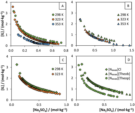 Binodal curves of the ternary systems, composed of (A) [N4444][Theop], (B) [N4444][Theob], or (C) [N4444]Cl, water, and Na2SO4 at 298 K (green), 323 K (orange), or 353 K (blue) (±1 K) and atmospheric pressure (0.1 MPa). [N4444]Cl was not tested at 353 K. (D) Comparison of the binodal curves of [N4444][Theop] (o), [N4444][Theob] (Δ), or [N4444]Cl (◊) at 298 K, using Na2SO4 as a salting-out agent.