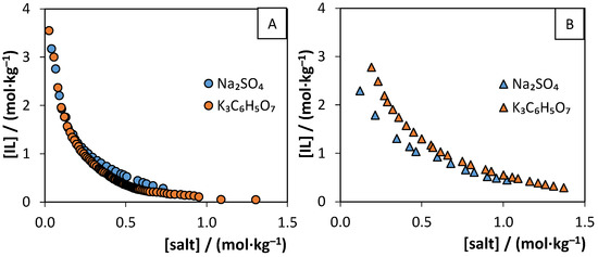 Experimental results, presented in Figure 4, show that the salt influence on the formation of the ABS depends on the IL. In systems using [N4444][Theop], the binodal curves are similar, with K3C6H5O7 being a slightly better ABS inducer than Na2SO4. The same does not apply for [N4444][Theob] binodal curves, with Na2SO4 being a better ABS promoter than K3C6H5O7. This change in tendency was also observed with other ILs [67]. Take the formation of ABS with [N4444]Cl/[N4444]Br and Na2SO4/K3C6H5O7 as an example, for which the K3C6H5O7 salt ability to form ABS with [N4444]Br is slightly better than the one reported for Na2SO4 [68]. However, the anion change from bromide to chloride leads to the modification of this tendency, with K3C6H5O7 being a stronger salting-out agent than Na2SO4 [67,68]. Overall, the salt seems to have a small impact on the binodal curves, under the tested conditions.