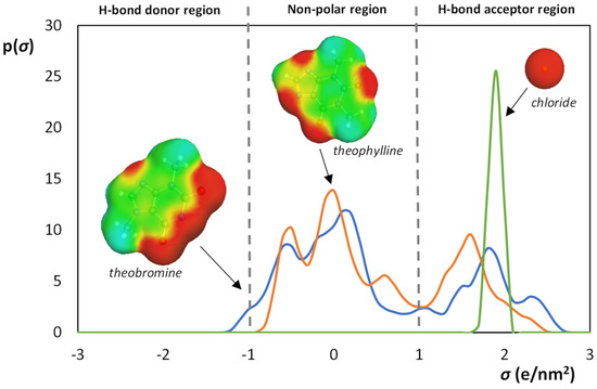 The ILs ability to form ABS increases as follows: [N4444]Cl < [N4444][Theob] < [N4444][Theop]. Among the evaluated ILs, [N4444][Theop] showed the best ability to form ABS and the most significant thermoresponsive behavior. Although [N4444][Theob] and [N4444][Theop] have a strong structural similarity, their ability to induce demixing is different. The demixing capacity is ruled by the competition of all ions for the formation of hydration complexes [67]. This correlates with both the hydrogen-bond basicity of the IL and the molar entropy of the salt. High charge density salts are more prone to establish water hydration complexes, inducing the formation of the ABS, by salting-out the IL from the aqueous media. ILs with higher affinity for water and, therefore, higher hydrogen-bond basicity, difficult their salting-out and, consequently, ABS formation. To better understand the obtained experimental results, the -profiles and hydrogen-bonding interaction energies (EHB) of each IL were determined using COSMO-RS. The -profiles and surfaces of the IL anions are presented in Figure 5. As expected, the -profiles of the theophylline and theobromine anions are similar, presenting the main peaks at the non-polar and H-bond acceptor regions, while chloride anion has a single peak at the H-bond acceptor region. In what concerns the hydrogen-bonding interaction energies of the studied ILs, the EHB increased as follows: −6.45 kJ [N4444][Theob] < −4.51 kJ [N4444]Cl < −3.55 kJ [N4444][Theop]. ILs with more negative EHB values are more prone to accept protons and, thus, to interact with water [67]. As seen by the presented values, [N4444][Theob] has the most negative EHB value, meaning that the liquid–liquid demixing occurs at higher IL concentrations than for [N4444][Theop]. This is not so straightforward for [N4444]Cl. Although the binodal curves of [N4444]Cl and [N4444][Theob] are similar (Figure S2, Supplementary Materials), their EHB values are considerably different.
