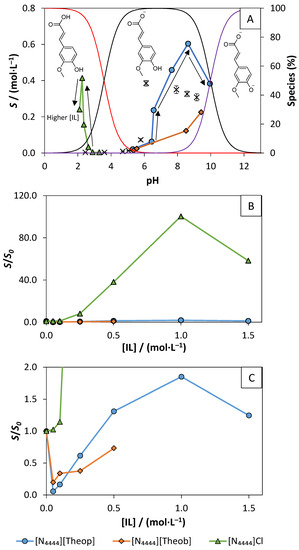 The IL solutions saturated with ferulic acid have different pH values over the tested IL concentrations range (Supplementary Materials-Table S14). The addition of ferulic acid to the IL solutions lowered their pH, with this change being more evident in solutions with lower IL concentrations. Controlling the pH of the samples would require the addition of buffers, which would interfere with the solubility enhancement assays. For this reason, no attempts were made to adjust the pH values of the samples, and, for each sample, the initial and final pH values were registered. In the [N4444]Cl solutions, the pH of the samples was similar to the different IL concentrations, ranging from 2.10 to 3.29. In this case, ferulic acid was in its neutral form and [N4444]Cl improved its solubility (up to 117-folds) through hydrotropy in a pH-independent way (Figure 7A). For [N4444][Theob] and [N4444][Theop], a wide range of pH values were obtained, depending on the IL concentration. For [N4444][Theob] and [N4444][Theop], the pH of the samples increases as the IL concentration increases (5.36 to 9.62 and 5.30 to 9.95, respectively), leading to the deprotonation of ferulic acid. When ferulic acid is deprotonated, its solubility is mostly ruled by pH, rather than hydrotropy. Due to the impact of pH in the solubility of ferulic acid, the S/S0 was recalculated using the ferulic acid water-solubility at the most suitable pH, i.e., using a S0 value determined to be at a similar pH value to that of the sample. To do so, the water-solubility (S0) of ferulic acid was determined at different pH values (consult Table S15 in the Supplementary Materials). Since the addition of ferulic acid significantly lowers the pH of the aqueous solutions, it was necessary to add NaOH to the aqueous solutions, in order to measure its water-solubility at high pH values. The S/S0 recalculation (Figure 7C) showed that the solubility enhancement of ferulic acid, by [N4444][Theob], is mainly ruled by pH, being its solubility improvement lower than the one provided by pH alone (S/S0 < 1). Regarding [N4444][Theop], at IL concentrations ranging from 0.5 to 1.5 mol∙L−1, the ferulic acid solubility enhancement is higher than the one caused by pH (S/S0 > 1). This means that [N4444][Theop] has a hydrotropic effect besides the pH-dependent solubility enhancement. The ferulic acid solubility seems to achieve its maximum peak at IL concentrations of 1.0 mol∙L−1.
