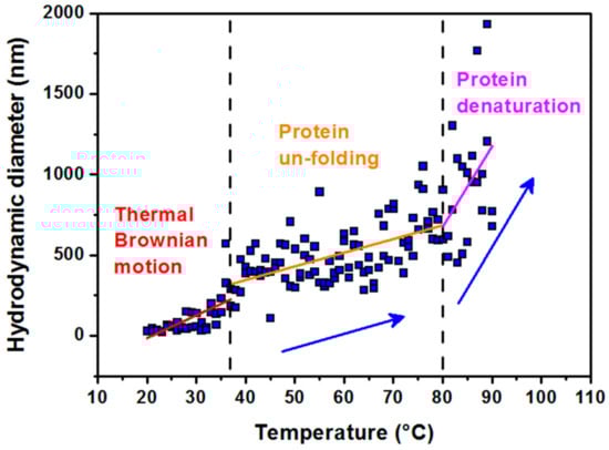 Hydrodynamic diameter dependence vs. temperature of the solutions. Data were obtained in the range from 20 to 90 °C for a colloidal solution of apoferritin in AMPSO buffer at pH 8.6, showing three characteristic modes of apoferritin conformation. The first region of 20–37 °C (physiological temperature) refers to the thermal Brownian motion of apoferritin particles. The second region of 37–80 °C shows the protein unfolding behavior and the third one above 80–90 °C illustrates the protein denaturation region.