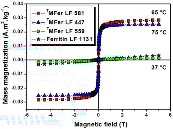 Magnetization curves of magnetoferritin. Data were obtained at 22 °C for TMFer (magnetoferritin) with LF (loading factor): 581, 447, and 559 prepared at various synthesis temperatures marked on the graph (37, 75 and 65 °C). T prefix in TMFer labeling was used for specification of magnetoferritin samples prepared at three different synthesis temperatures with similar LF.