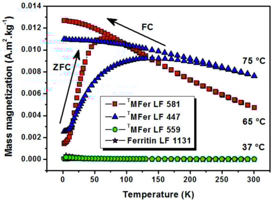 Thermomagnetic curves after cooling at zero magnetic field (ZFC)/under 7.96 kA/m magnetic field (FC) for magnetoferritin. TMFer with LF: 581, 447 and 559 was prepared at various synthesis temperatures marked on the graph (37, 65, and 75 °C). T prefix in TMFer labeling was used for specification of magnetoferritin samples prepared at three different synthesis temperatures with similar loading factor (LF).
