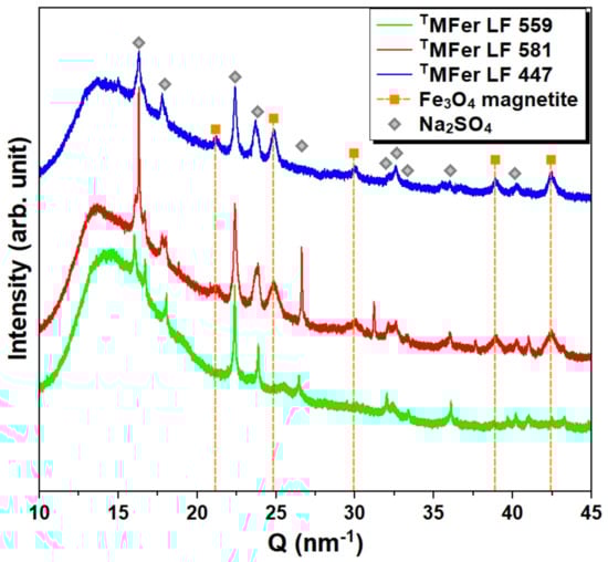 By the method of phase analysis based on X-ray diffraction data, we identified the crystalline phase of sodium sulfate Na2SO4 in all studied samples, resulted, as we suppose, from the Mohr’s salt reaction with NaOH. Mohr’s salt was used as a source of ferrous ions and NaOH to regulate the pH of the AMPSO buffer. Except for Na2SO4 crystallization in all samples, the magnetite (Fe3O4) phase was identified in TMFer samples with LF 581 and 447. This phase is not present in the TMFer sample with LF 559, prepared at the lowest synthesis temperature, i.e., 37 °C (Figure 5), resulting in the non-crystalline phase of the iron core and an increase in the amorphous background.