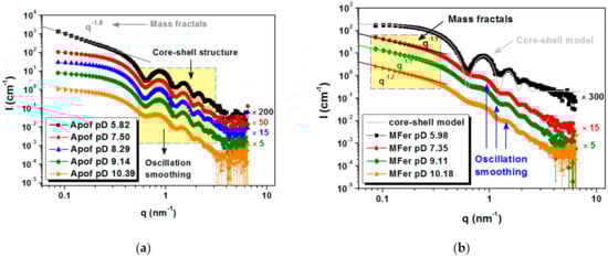 Typical core-shell oscillation peaks were observed at 0.6 nm−1 for apoferritin in an aqueous medium (Figure 6a). The increased scattering intensity at small q values for pD 5.82 indicated the presence of aggregated particles and the appearance of mass fractals with dimension D = 1.8, modeled using the power-law function I(q)~A/qα [43]. This pD value is near the region of isolelectric point, where apoferritin coagulation at zero total charge is typical (pI ~4.58 ± 0.02) [44]. The smeared oscillations at pD 10.39 are most likely caused by the partial decomposition of the biomacromolecule into protein subunits (Figure 6a).