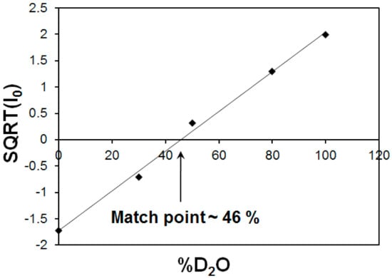Square root of the scattering intensities at zero angle (Io0) as a function of D2O volume fraction. The intersection of the fitted straight line with x-axis corresponds to match point of 46% for MFer with LF 190.