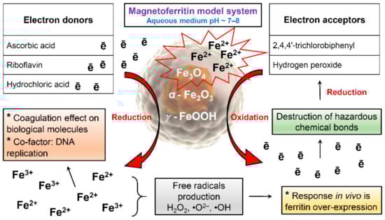 Our studies of samples obtained in vitro do not exclude the simultaneous presence of magnetite, hematite, and lepidocrocite in MFer samples. The iron core in the prepared MFer undergoes post-synthesis transformations associated with redox reactions in response to potential external effects of oxygen, changes in temperature or pH in the liquid state. This apparent lack of sensitivity causes the reactivity of MFer colloidal solutions, especially in interactions with other substances: vitamins [25], dangerous molecules such as polychlorinated biphenyls (PCBs) [49] or hydrogen peroxide (H2O2) [50], schematically illustrated in Figure 8.