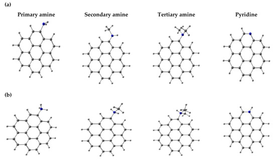 Hence, a model of AC made up of a seven-membered-ring graphene sheet (coronene) was selected to study the effect of nitrogen basic surface groups (SGs) during adsorption of CLD and β-HCH. This model neglects the influence of pore shape, defects, pore size, and pore connectivity but instead allows the performance of a large number of calculations with a higher theoretical level in order to achieve a better chemical description of the studied phenomena. This study only considers modifications in the edge of coronene that do not affect the aromaticity of the system. Depicted in Figure 1a,b, the models provide either the aromatic character or graphene structure and the SGs at the edges of AC. In addition, this model was selected to compare the results obtained in the present work with previous works of our research group related to the study of the adsorption process of CLD and β-HCH onto acidic AC [24,29,30].