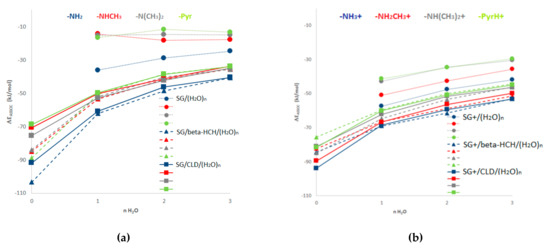 Thermodynamic association energy (ΔEASSOC) for the systems SG/(H2O)n=1–3, SG/β-HCH/(H2O)n=0–3 and SG/CLD/(H2O)n=0–3 including the charged forms of SG. (a) Neutral and basic pH condition (β-HCH and CLD molecule and neutral SG); (b) acidic pH condition (β-HCH and CLD molecule and protonated SG).