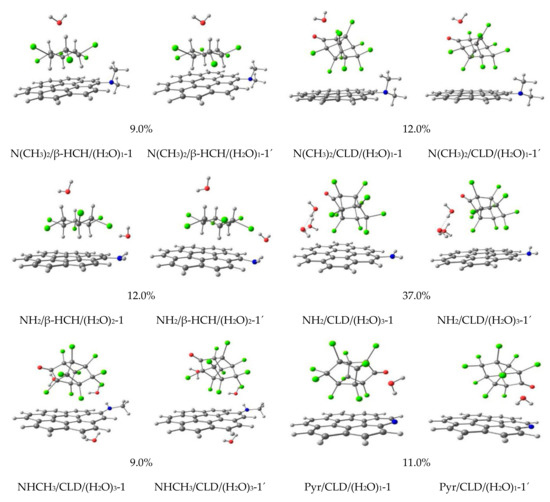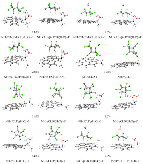 Figure 4 and Figure 5 show the 14 obtained geometries of the global MMH minima after being reoptimized using DFT (figures identify by quoted numbers). As can be seen, in general, all structures keep their initial geometries. Thus, the reoptimized geometries do not differ significantly from the ones obtained from the semiempirical optimization by PM7. However, some differences for the Cl···C interactions were observed in the supermolecules, increasing the interactions between the chlorine atoms of the pesticides and the carbon atoms of the graphene surface (Pyr/CLD/(H2O)1-1′ and NH3+/CLD-1′). This could be taken as a signal of the importance of this kind of interaction in the stabilization of the studied systems. Moreover, it can be assumed that PM7 overestimates this kind of dispersive interaction. In fact, previous works show the same behavior for Cl···C interactions [29,30,60] using the same level of theory. However, the PM7 semiempirical Hamiltonian was able to qualitatively describe the association complexes in terms of interaction types. These results demonstrate that the use of a semiempirical Hamiltonian can describe the main interaction types in the potential energy surfaces.