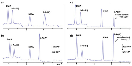 Ion electropherograms recorded in a CE-MS system for the determination of organic and inorganic arsenic compounds [70]: (a,b) 25 μg·L−1 standard solution (c,d) water sample with a natural content of 0.66 μg·L−1 i-As(V) and spiked with 1.0 μg⋅L−1 of DMA (dimethylarsinate), i-As(III) and MMA (mono-methylarsonate); (b,d) 10% (v/v) of a 11% (v/v) formic acid solution added to sample before injection. CE conditions: capillary—72 cm, 50 μm I.D., BGE—57 mM HFIP (hexafluoro-2-propanol) at pH 10.3, hydrodynamic injection—36 s at 50 mbar, V: +30 kV. (Reproduced under permission from Elsevier. License Number 5173120352687).