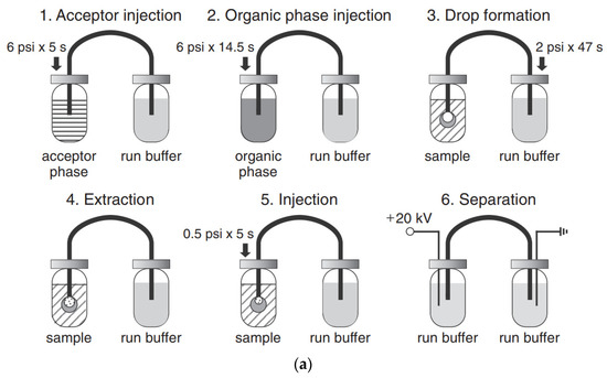 - Choi, K.; Kim, S.J.; Jin, Y.G.; Jang, Y.O.; Kim, J.S.; Chung, D.S. Single drop microextraction using commercial capillary electrophoresis instruments. Anal. Chem. 2009, 81, 225–230. [Google Scholar] [CrossRef]