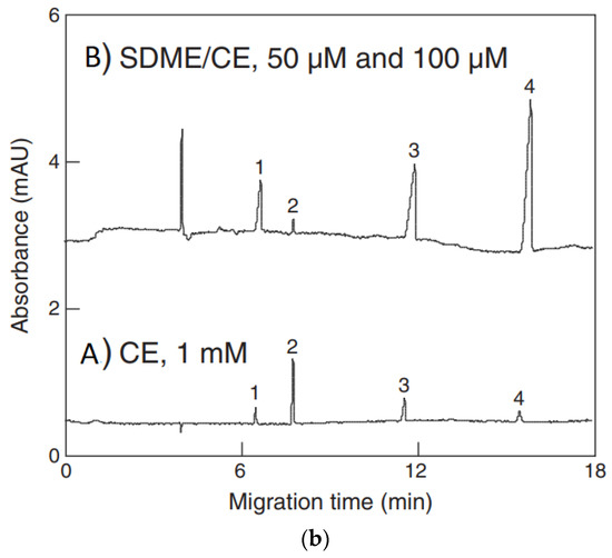 CE with UV detection was also used for the speciation analysis of various trace elements, such as mercury [27,28,29,30], selenium [31] and arsenic [32,33]. Because mercury does not exhibit UV absorption, compounds containing thiol (–SH) groups were used as chelating reagents, including l-cysteine (l-Cys) [27,29,30] and 3-mercapto-1-propane-sulfonic acid [28]. By employing UV detection, determination in real water samples became possible with the use of various pretreatment and preconcentration steps.