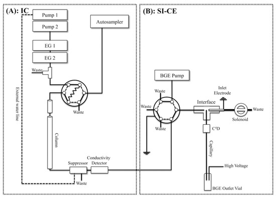 Schematic diagram of a two-dimensional ion chromatography (IC) (A) and sequential injection (SI)-capillary electrophoresis (CE) system with conductivity detections developed for the determination of inorganic anions and organic acids in waters (B) [79]. (Reproduced under permission from ACS, licence is not required).