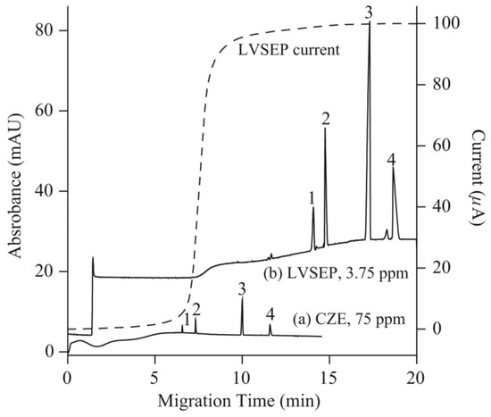 Electropherograms recorded for arsenic speciation using CE-UV without (a) and with (b) large volume sample stacking with an electroosmotic flow pump (LVSEP) (b) [33]. In (a): recording for 75 ppm As of each As species (1; As(V), 2; MMA, 3; As(III), 4; DMA) in deionized water injected at 0.5 psi for 5 s, and (b): recording LVSEP of 3.75 ppm of each As species in 0.1 mM sodium phosphate buffer with full injection. CE conditions: μSiL-FC coated capillary—60 (50) cm, 50 μm I.D., BGE—100 mM sodium phosphate at pH 9.6, V: 20 kV, UV detection at 200 nm. Dotted line: electric current. (Reproduced under permission from Elsevier. License Number 5173120740442).