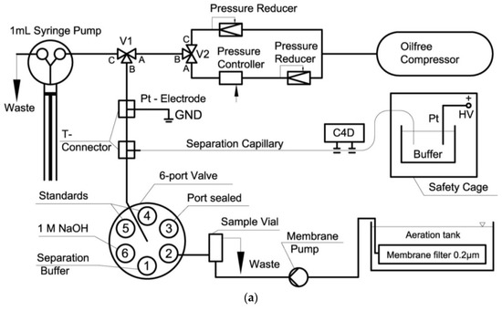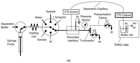 - Mai, T.D.; Schmid, S.; Muller, B.; Hauser, P.C. Capillary electrophoresis with contactless conductivity detection coupled to a sequential injection analysis manifold for extended automated monitoring applications. Anal. Chim. Acta 2010, 665, 1–6. [Google Scholar] [CrossRef]