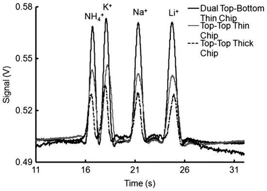 Comparison of the applications of different detector cell designs in CEs of inorganic cations with contactless C4D conductivity detection [101]. Electropherograms recorded for 0.5 mM cations (K+, Ca+, Mg+, Li+) using electrodes in dual top–bottom (black line), top–top (gray line) positions using thin chips, and in the conventional top–top configuration with thick chips (dotted line). CE conditions: channel—85 (65) mm × 50 × 50 μm, BGE—20 mM MES/His, 2 mM 18-crown-6, pH 6.4, injection at 0.5 kV for 5 s, V: +3 kV. C4D detector: a sinusoidal excitation signal of 22 Vpp (peak-to-peak) at 300 kHz; electrode distance, 1 mm; electrode width, 1 mm. (Reproduced under permission from John Wiley and Sons. License Number 5173110627787).