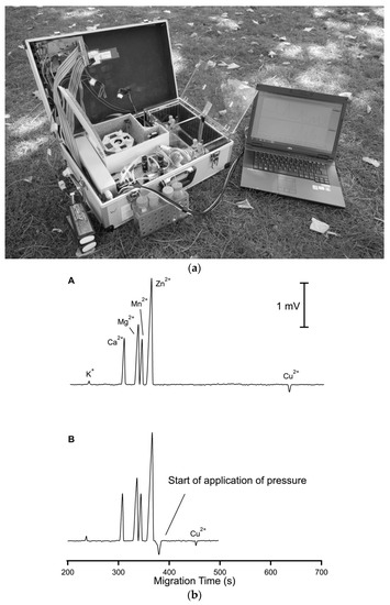 Based on the designs reported so far for such systems, conductivity detection is well suited to portable CE systems for the determination of ionic species because of their straightforward miniaturization and very limited electrical power consumption. A portable CE instrument with a C4D detector was successfully applied in the investigation of sediment porewaters [8,52]. The separation and quantitative determination of major inorganic anions and cations, including Mn(II) and Fe(II) ions, was achieved in less than 15 min. The sediment samples were collected from lakes and analyzed immediately in the field. By avoiding the transport of the sample, its composition was preserved, which made it possible to study geochemical processes. The electropherograms of the sediment porewater samples are shown in Figure 8 [52].