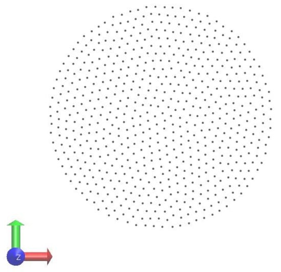 Let us consider the case when a dusty plasma monolayer consists of several hundred micron polymer particles coated with a metal film. Then, the movement of each individual particle will largely depend on the interaction with neighboring particles and on external conditions. The strong interaction of particles is due to the presence of an electric charge on them and the properties of the surrounding nonequilibrium low-pressure gas discharge plasma [1,2,3,4,5,6,7,8,9,10,11]. The model assumes that the particles have the same size and composition and are uniformly covered with a thin metal film capable of absorbing laser radiation. The initial arrangement of the particles is uniform in the plane of the monolayer. The potential of Yukawa was chosen as the potential for interaction: