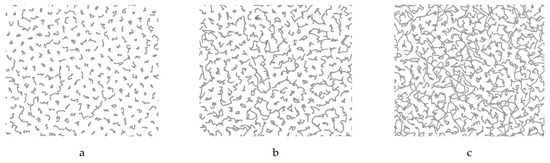 The two-dimensional region, limited by a potential trap with a radius of 28 mm (Figure 1), was filled with particles in the amount of N = 625, with an interparticle distance of 1 mm and a particle diameter of 10 µm, the mass of particles was calculated based on the density of melamine-formaldehyde and the thickness of the copper coating of 100 nm and amounted to 10−9 g. The charge on the particles was taken as equal to 10,000 electron charges, which corresponds to the data of many works, see, for example, [5]. The determination of the effective nonideality parameter Γ* was carried out by calculating the radial distribution function of particles (pair correlation function) using the method described in [21]. The studies were carried out for different values of the initial effective nonideality parameter Γ*0, as well as for different values of the average force caused by the heating of the particle surface by laser radiation. After “switching on” the force , the system was held for 50 s in order to come to a stationary state, which was characterized by a fairly stable average kinetic energy of the dust subsystem. Figure 2 shows the trajectories of particles obtained in 0.3 s for different values of the force and the initial effective parameter of nonideality Γ*0 = 300. As expected, with an increase in the force , an increase in the intensity of the kinetic motion of the particles (effective temperature) of the system is observed. In this case, if = 10 fN, we have Γ* ≈ 200, if = 20 fN, we have Γ* ≈ 50, and if = 40 fN, we have Γ* ≈ 15.