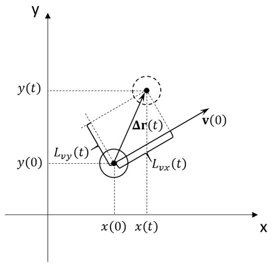Scheme for calculating the linear displacement of a particle along and perpendicular to the direction of the initial velocity.