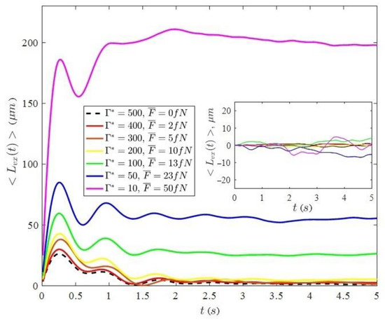 As can be seen from the graphs presented, the value of the average linear displacement along the vector of initial velocities first increases sharply, and the growth occurs at times corresponding to the ballistic regime of particle motion (see Figure 3). Here, the particles move mainly along the vector of their initial velocity. Further, the value of the average linear displacement reaches its local maximum and, performing damped oscillations, reaches an almost constant value, where the diffusion mode of motion is realized. It can be seen that both the value of the first maximum and the constant value of saturation in the diffusion mode depend on the value of the average force . With increasing force values, the displacement increases, i.e., the activity of the system is increasing. Different values of the external force make it possible to realize different effective parameters of the nonideality of the system. For the value of the average linear displacement perpendicular to the vector of the initial velocity (inset in Figure 5), there is a slight increase in the amplitude of oscillations near zero.