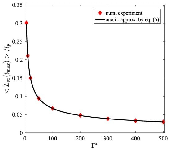 Figure 6 shows the dependence of the maximum value of the average linear displacement along the vector of the initial velocity on the effective parameter of the nonideality of the system realized under the given conditions. It can be seen from the graph that the maximum values that the value takes is associated with the effective parameter of the system’s nonideality through a simple relation: