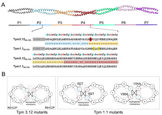 Tpm1.1 and Tpm3.12 peptides design. (A) Schematic representation of the fragments with respect to the full-length model of Tpm (PDB ID: 1C1G). Sequence comparison of designed Tpm3.12 and Tpm1.1 fragments. The alignment was performed in UniProt, accession numbers P09493 for Tpm1.1 and P06753 for Tpm3.12. Stars between the sequences indicate identical amino acid residues, dots indicate sites where the sequences differ. Blue, orange, and magenta indicate positions of actin-binding periods 2, 3 and 4, respectively. Lower case italicized letters on top of the sequences show positions of the amino acid residues in heptad repeat and a and d positions are shown in cyan and red, respectively. Mutation sites related to hypo- and hypercontractile phenotypes are highlighted in yellow and red, respectively. The N-terminal fusion peptide (shaded with gray) comprises amino acid residues left after proteolysis of His-tag with thrombin, followed by Cys and elastic Gly-Gly linker introduced during peptide construction. (B) Illustration of the coiled-coil wheel where positions of the mutations are indicated by arrowheads.