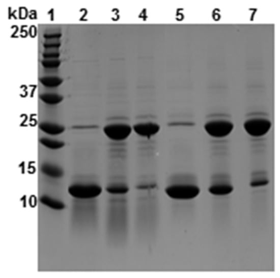 The changed codons are underlined. The oligonucleotides were synthesized and HPLC was purified by the Laboratory of DNA Sequencing and Oligonucleotide Synthesis, Institute of Biochemistry and Biophysics (Warsaw, Poland). The PCR reaction was performed according to the method supplied by the manufacturer (https://www.agilent.com/cs/library/usermanuals/public/200523.pdf, accessed on 15 November 2021). The amplification reaction involved initial DNA melting (95 °C, 30 s), then 11 cycles of melting (95 °C, 30 s), and primers annealing (55 °C, 1 min) and extending (68 °C, 6 min). The parental DNA template was digested with the DpnI restriction enzyme and PCR products were transformed into XL-1 supercompetent cells, DNA was isolated (GeneMATRIX Plasmid Miniprep DNA Purification Kit, EURx), and the substitutions were verified by DNA sequencing in the Laboratory mentioned above.
