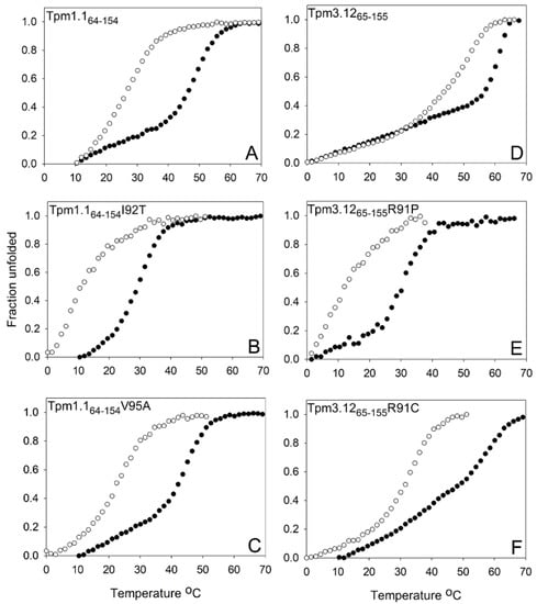 The flexibility of the Tpm coiled coil was reported to be crucial for the binding of Tpm to F-actin and the regulation of actomyosin interactions (reviewed by [1]). The highly conservative middle region comprising actin-binding period 3 is particularly important for the cooperativity of the actin filament regulation [20,21]. In humans, mutations in Tpm genes encoding actin-binding period 3 were linked to congenital myopathies and cardiomyopathies, muscle diseases that are manifested either by hypo- or hypercontractile phenotypes. In different Tpm genes, disease-causing mutations do not overlap, indicating that some regulatory properties are isoform-specific. It is not clear whether any particular structural changes in Tpm can be associated with Tpm functions leading to these phenotypes. To address this problem, in this work, we investigated the structural stability of peptides equivalent to sequences of the middle regions of Tpm1.1 and Tpm3.12, Tpm isoforms expressed in fast and slow muscle fibers, which contained sequences of actin-binding period 3 flanked by sequences from periods 2 and 4. The stabilities of wild-type peptides were compared to the stabilities of peptides carrying disease-causing missense mutations in period 3, which cause hypo- and hypercontractile phenotypes. CD measurements of thermal stability revealed that the middle region of Tpm3.12 was more stable than Tpm1.1. The mutations decreased thermal stability in the peptides with different degrees and had various effects on the peptide structure, but we did not observe any particular structural changes which determined the opposite phenotypes.