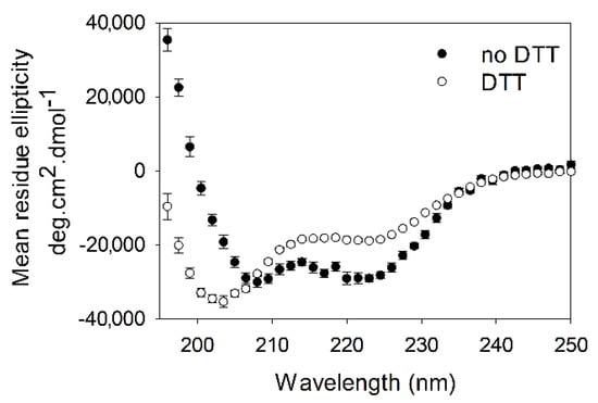 In order to further evaluate the folding of Tpm3.1265–155R91P under reducing conditions, CD spectra were measured to evaluate the secondary structure changes induced by the R91P mutation (Figure 4). Under non-reducing conditions, Tpm3.1265–155R91P showed a profile characteristic for a protein that is mostly α-helical; however, upon treatment with DTT, the structure became significantly disordered as judged by the shift of the X-axis intersection point to lower wavelengths and the increase in the mean residue ellipticity at 222 nm from −28,370 to −19,057 deg.cm2.dmol−1, which accounts for the ~40% decrease in α–helical content.