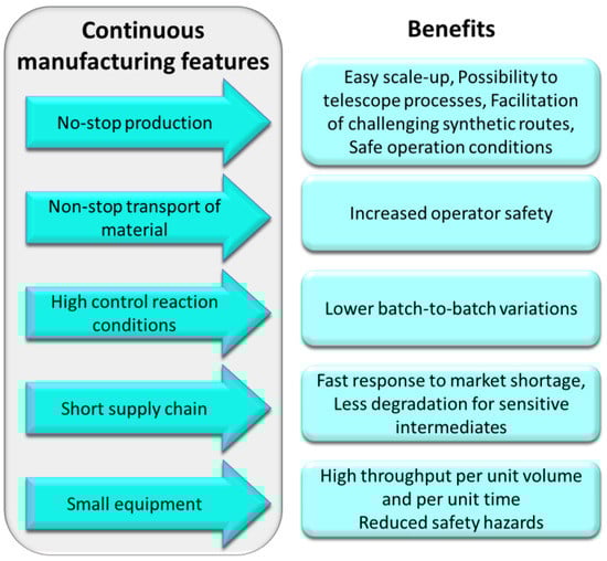 Compared to batch manufacturing, continuous manufacturing offers higher quality products and less batch-to-batch variability because of the high control over reaction conditions (e.g., temperature, pressure, and reaction time). For the same reason, flow technology enables chemists to easily perform reactions that would be very challenging in batch mode [19] due to extreme conditions, such as high- and low-temperature conditions [20,21,22,23], high pressure [24,25,26], the presence of highly reactive and unstable intermediates [27], as well as photo- or electrochemical processing at scale [28,29,30,31,32]. The modular nature of this technology and the robustness of individual reactor components not only provide flexibility but also facilitate the expansion of the applications of flow reactors to different industrial processes, which can mitigate production-chain incidents [7]. Additionally, the closed environment of flow reactor systems provides safer working conditions, preventing the operator from being in direct contact with hazardous chemicals [33,34]. The small equipment requires less laboratory space and reactor miniaturization intrinsically improves the quality of the reactions due to the excellent mass and heat transfer. Continuous flow processes can be telescoped and automated [35,36] aided by the integration of suitable process analytical technologies (PAT) and purification modules, which accelerate the production retaining product quality and increase product throughput [37,38]. Telescoped processes also improve the green aspects of the manufactory process because the product of a reaction does not need to be isolated and stored before being used in the following step but can directly flow to the next reactor [33,39,40,41].