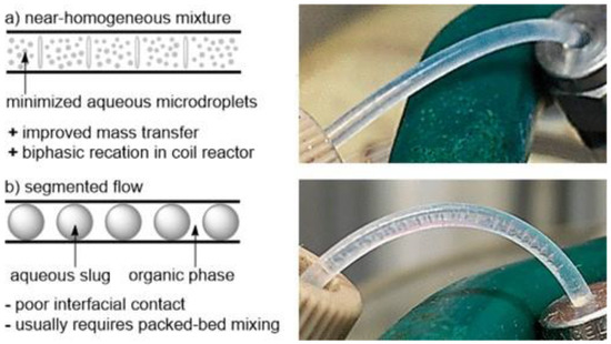 (a) Near-homogeneous mixture produced by a cross mixer with small diameter; (b) typical segmented flow of a biphasic mixture. Reprinted with permission from Org. Lett. 2019, 21, 6112–6116. Copyright 2019 American Chemical Society.