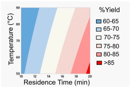 The first stage involves a DoE for the amide coupling in flow mode. Based on batch and flow experiments, the most favorable conditions were identified to safely use the unstable and potentially explosive amidation reagent HATU. The information obtained from the DoE optimization process (Figure 4) led to the synthesis of the desired amide intermediate in a very good yield (86%) within a short residence time of only 20 min.