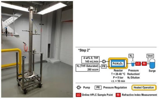 (Left) Photograph of the trickle bed reactor developed for the demonstration campaign; (Right) schematic representation of continuous nitro-reduction (step 2); Reprinted with permission from Org. Process Res. Dev. 2019, 23, 858–869. Copyright 2019 American Chemical Society.