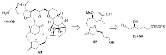 - Chavan, L.N.; Chegondi, R.; Chandrasekhar, S. Tandem Organocatalytic Approach to C28-C35 Fragment of Eribulin Mesylate. Tetrahedron Lett. 2015, 56, 4286–4288. [Google Scholar] [CrossRef]