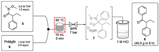 Continuous-flow preparation of ketone 8 from Weinreb amide 5.