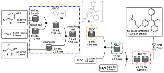 Next, four sequential transformations in a continuous-flow system were envisaged to generate (E/Z)-tamoxifen (Scheme 3). This sequence utilized seven perfluoroalkoxy (PFA) reactor coils carefully integrated to perform the four key steps of the synthesis: (a) lithiation of aryl bromide 9 in a cryogenic reactor at −50 °C, (b) addition of the resulting aryl lithium species (10) to ketone 8 at 30 °C, (c) activation of the lithium alkoxide intermediate (11) using trifluoroacetic anhydride (TFAA) at room temperature, and (d) base-mediated elimination at 100 °C. The procedure generates tamoxifen (12) with an excellent productivity of 9.35 g/h, which is equivalent to one daily dose every 5 s. It is worth noting that batch processing would not provide the flexibility to easily vary temperatures as exploited in this continuous route. In addition, the continuous system provides fine control over reaction conditions minimizing side-product formation and at the same time maximizing productivity and product quality.