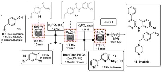 Imatinib (18) is the active API of the commercial anticancer drug Gleevec®. It is used for the treatment of chronic myelogenous leukemia and gastrointestinal stromal tumors [56,57,58]. The batch production relies on a multi-step sequence which is labor-intensive and time-consuming [59].